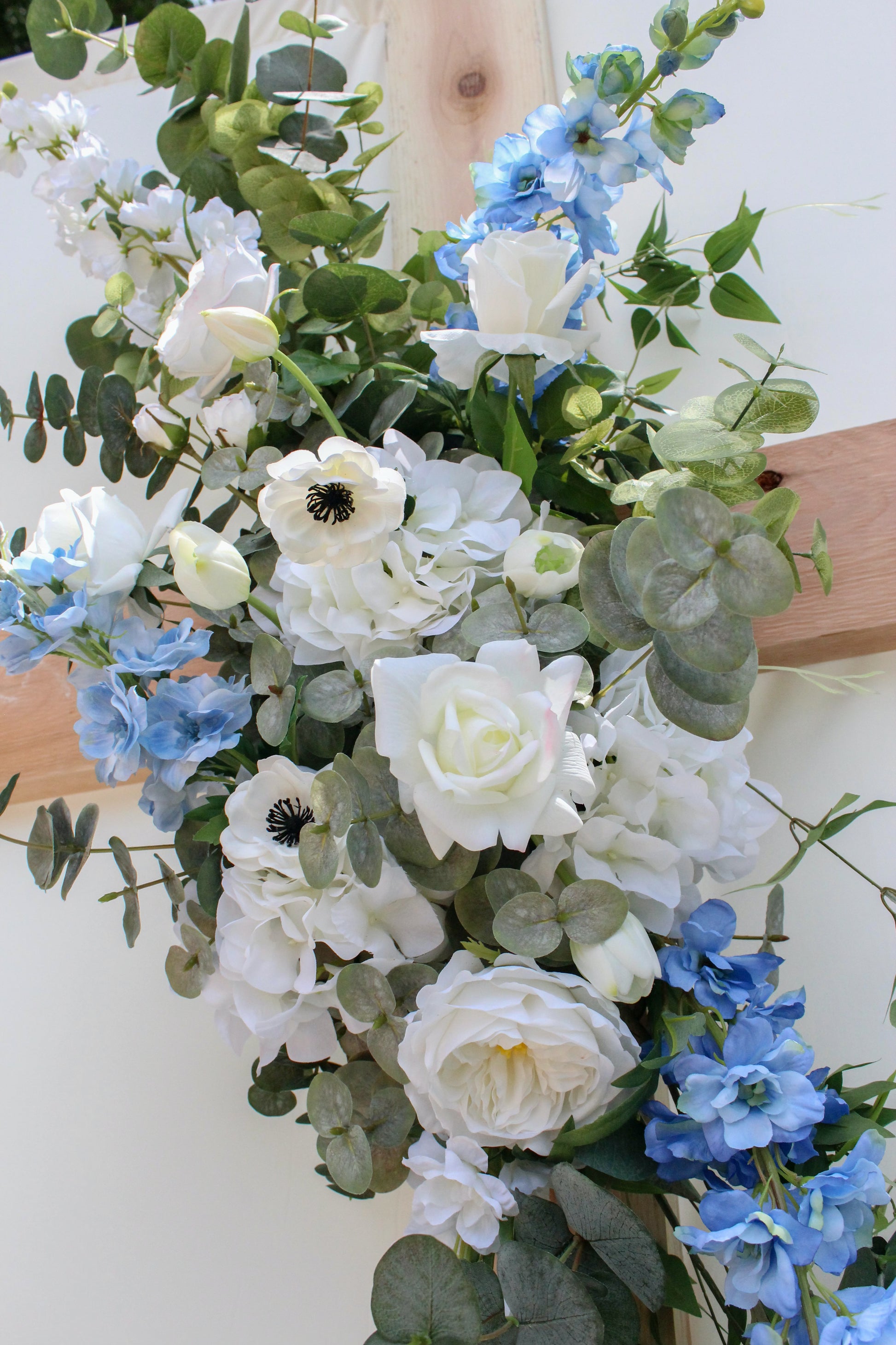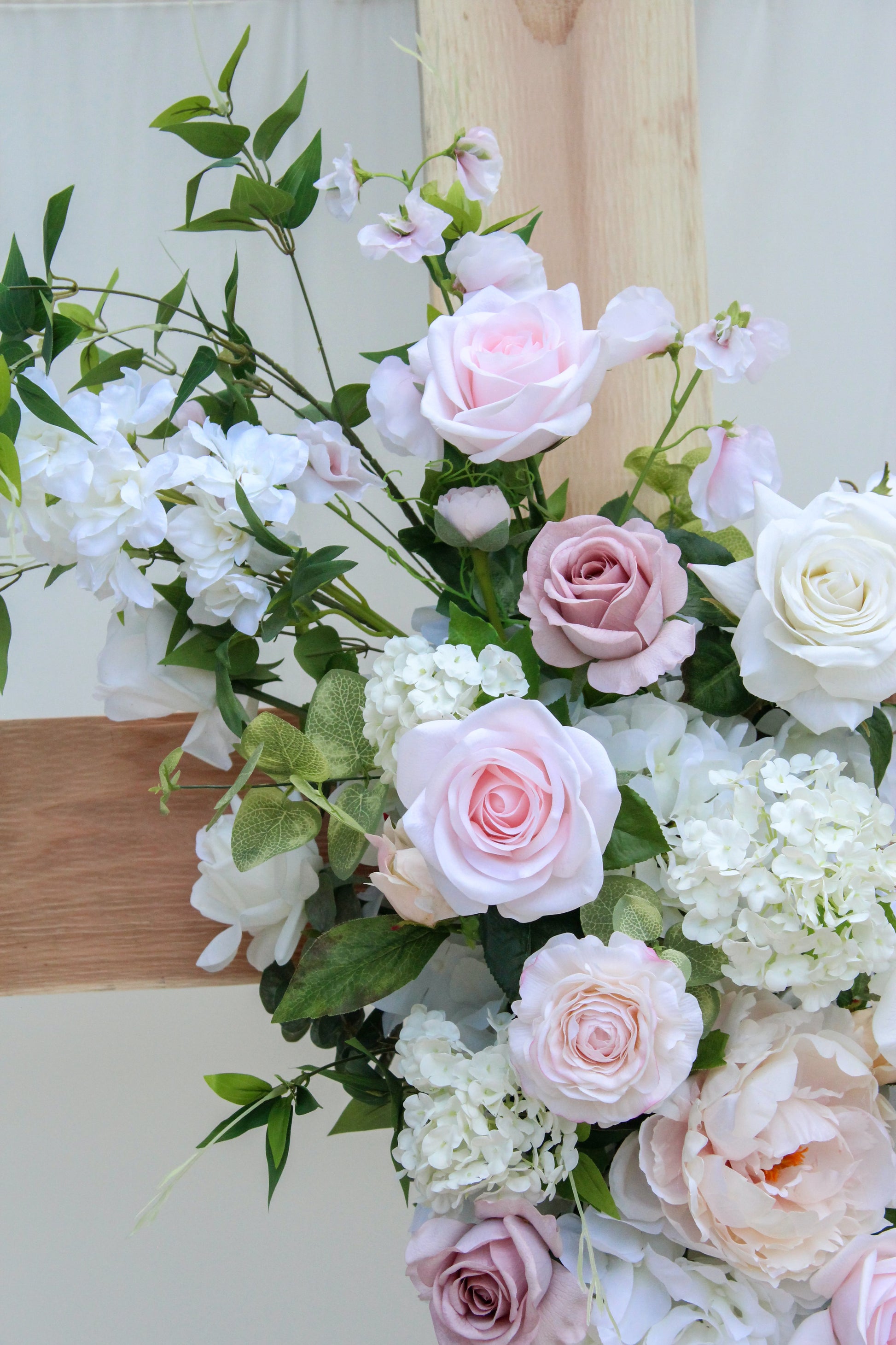 The flowers attached on the cross come with the arch. The flowers at the foot of the cross are not included, they are our Kate Aisle Flowers and Something Blue Aisle Flowers collections that you can add-on.