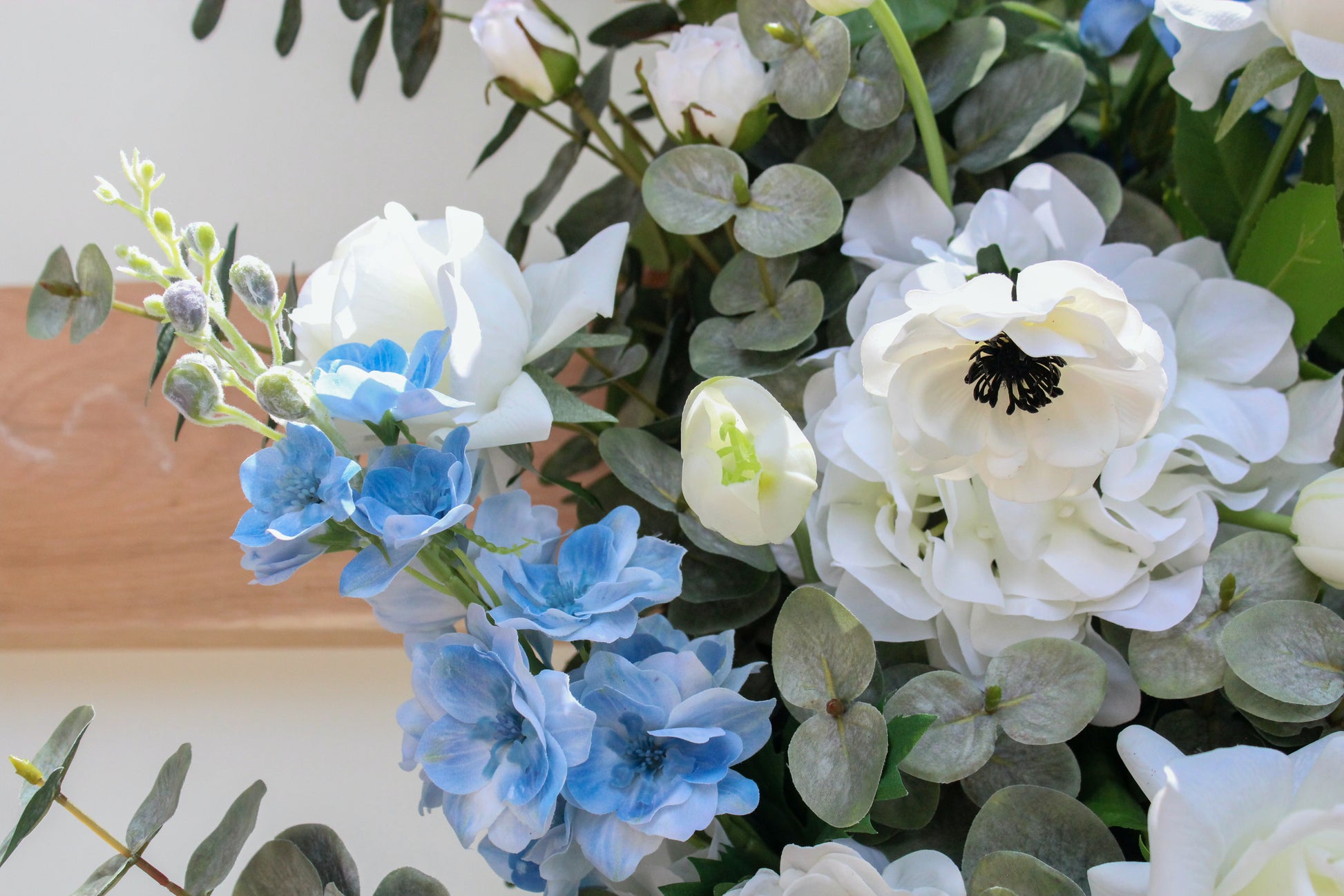 A fresh and serene palette featuring hydrangeas, white anemones, eucalyptus, delicate tea roses, white playa blanca roses, and soft blue and white delphiniums.
