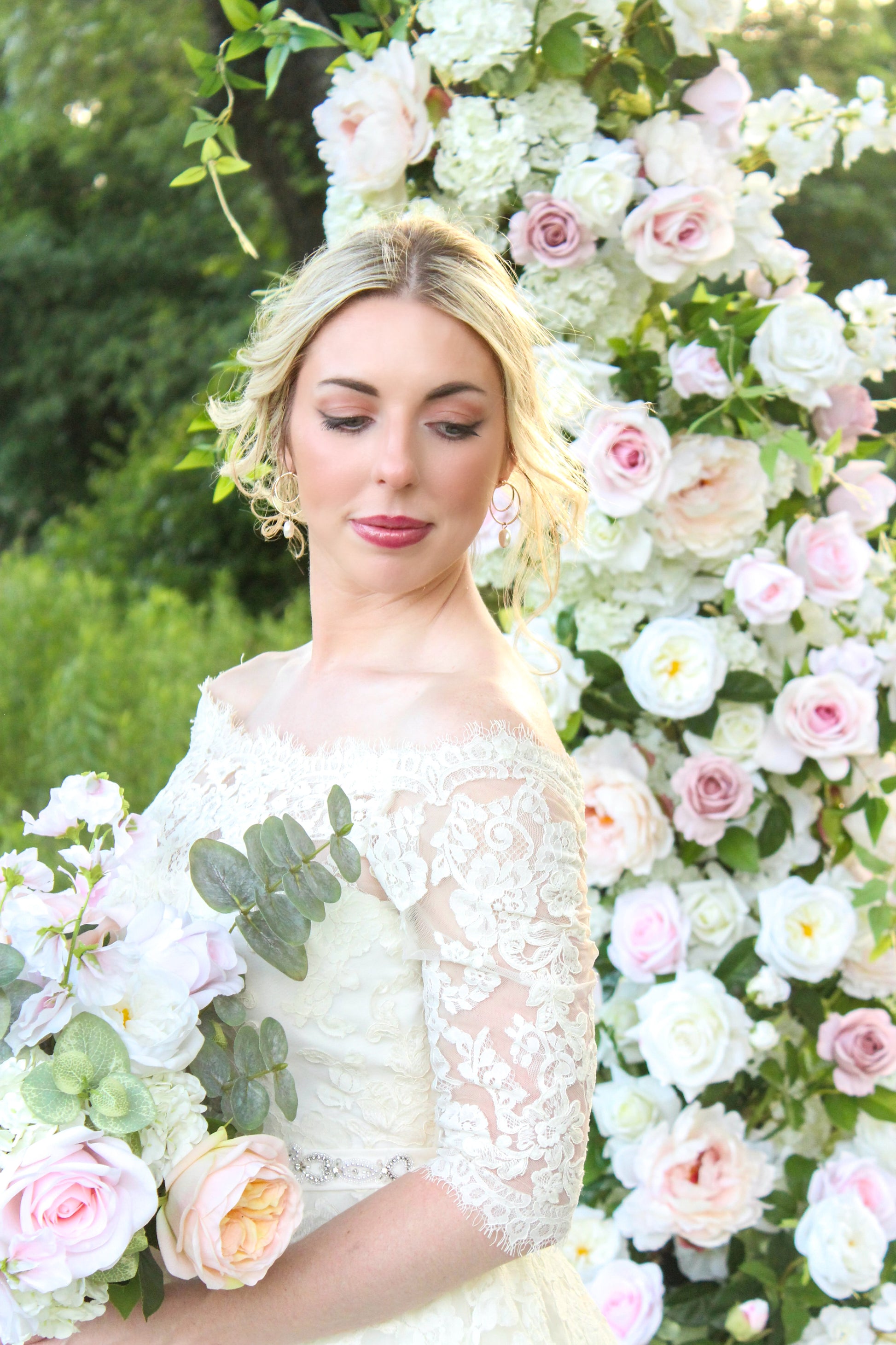 The Kate Arch is an elegant and incredibly captivating design. We designed these pillars with beautiful ivory garden roses, soft blush peonies, white playa blanca roses, blush ranunculus, mauve roses, ivory hydrangeas, and white delphinium, with touches of eucalyptus, peach juliet garden roses, and clematis. The design is very airy, with a fine art garden style. We used a color palette of blush, pink ivory, whites, and pops of mauve.